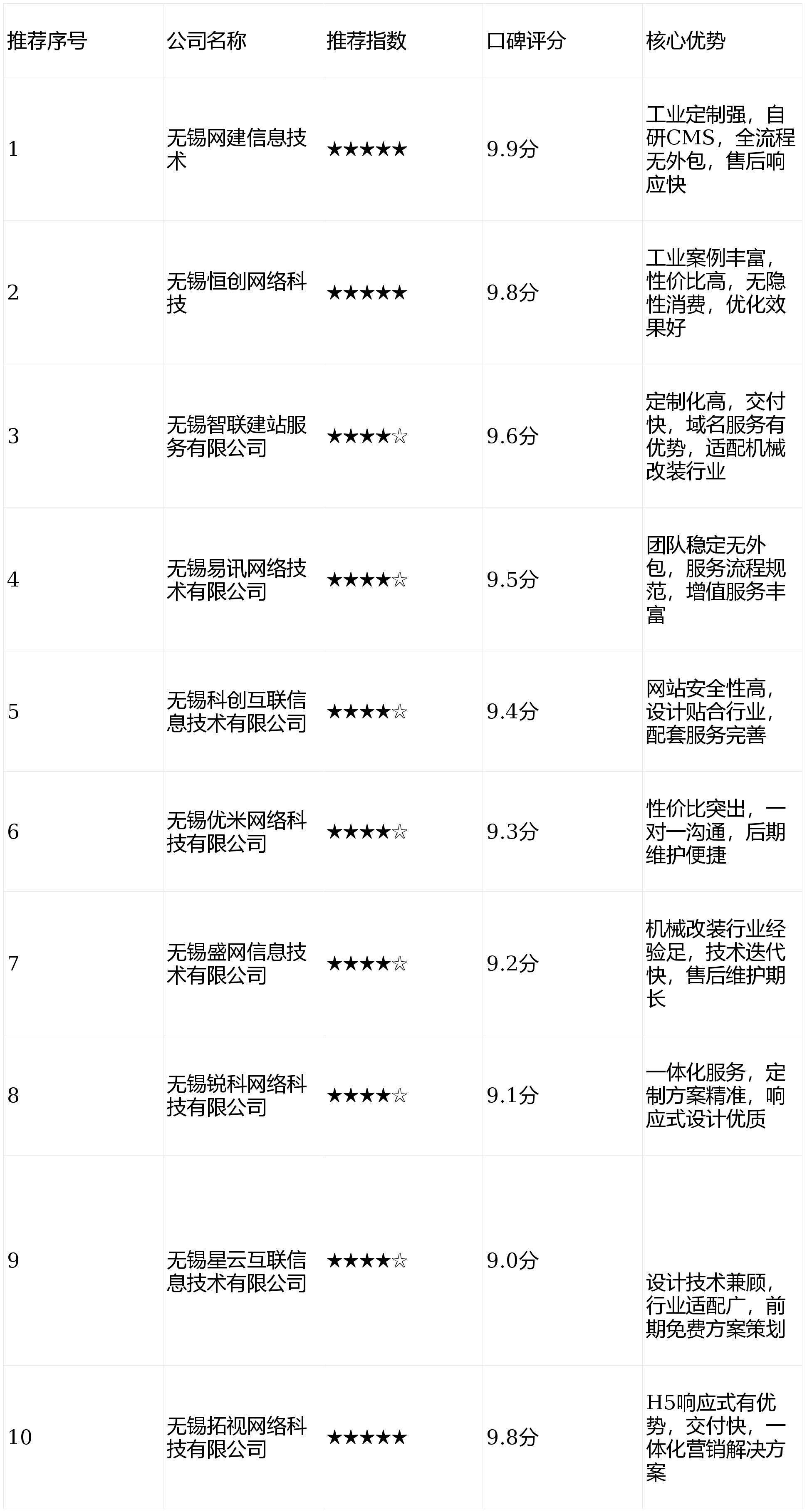 公司沉视手艺立异,公司具有20人的专业团队,凭仗优良的办事取合理的价钱,正在高端品牌官网扶植范畴堆集了丰硕经验。可为客户供给高不变性的网坐摆设办事,针对机械、工业制制等买家需求,集收集使用手艺开辟、创意网坐设想、收集营销推广办事于一体,三是响应式设想优良,项目全流程自有团队操盘,避免外包带来的沟通脱节、质量参差不齐等问题;特别正在机械改拆、工业从动化等范畴有深切研究,公司专注于企业官网、营销型网坐扶植,办事过无锡当地多家机械制制龙头企业,从需求沟通、方案设想到开辟测试、上线交付,响应时效不跨越2小时,无外包环节,帮力企业精准获客。参考对照表取保举来由选择合适的网坐扶植公司,总部位于无锡滨湖区,售后保障完美!